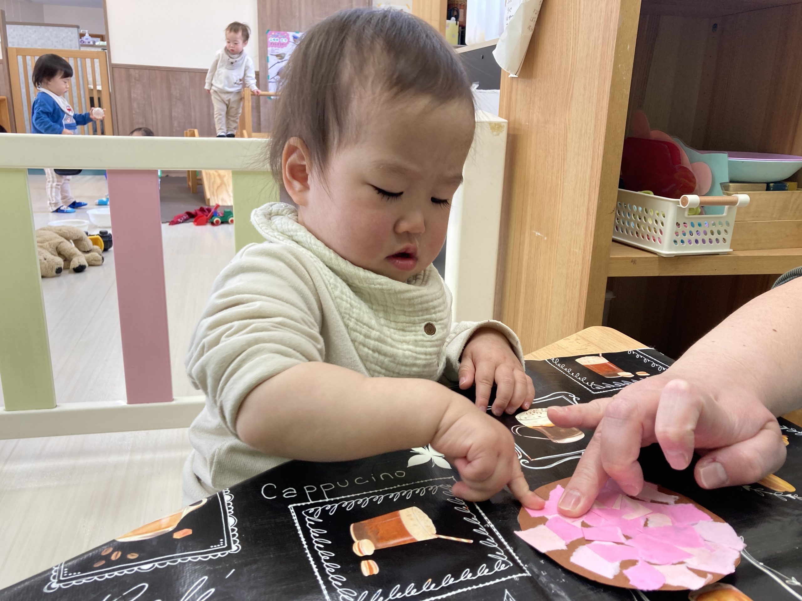 制作では初めてのりを使ってみました。のりの感触を嫌がることなくちょんちょんと指を使ってぬりぬりと楽しんでいました。細かい紙でしたが指先を器用に使って丁寧に楽しんでいました。塗り終わった後はペタっと貼って満足そうな表情がたくさん見られました。