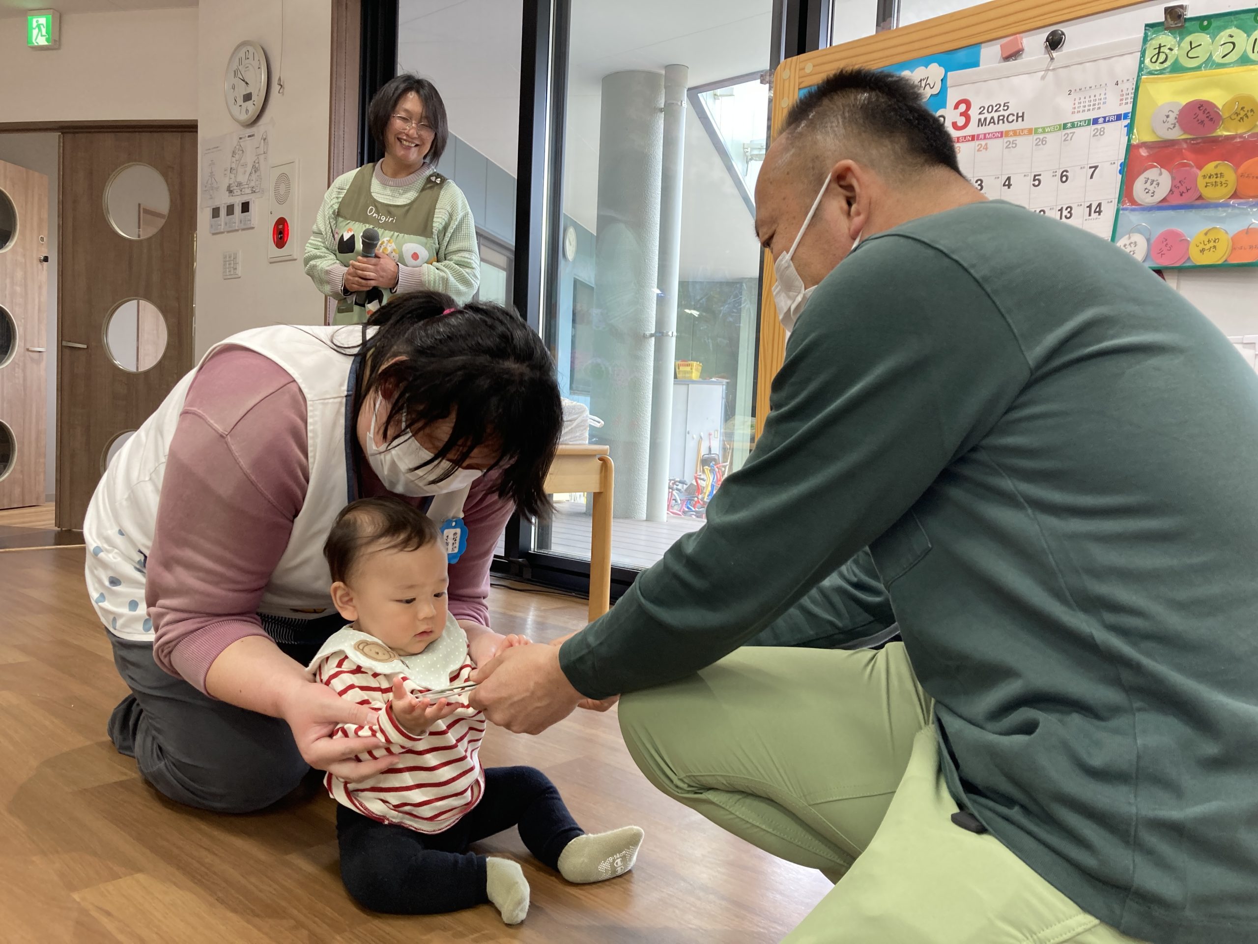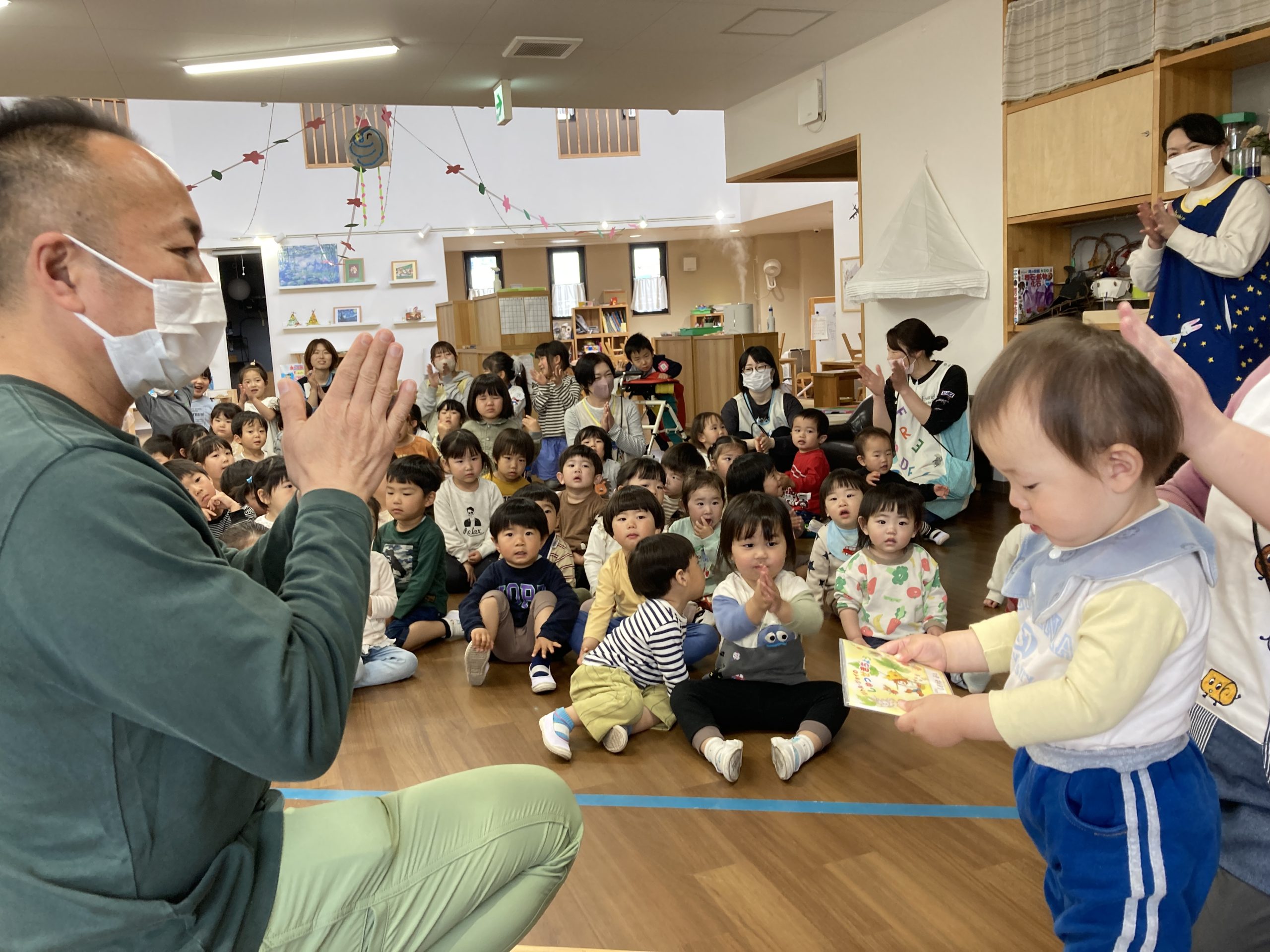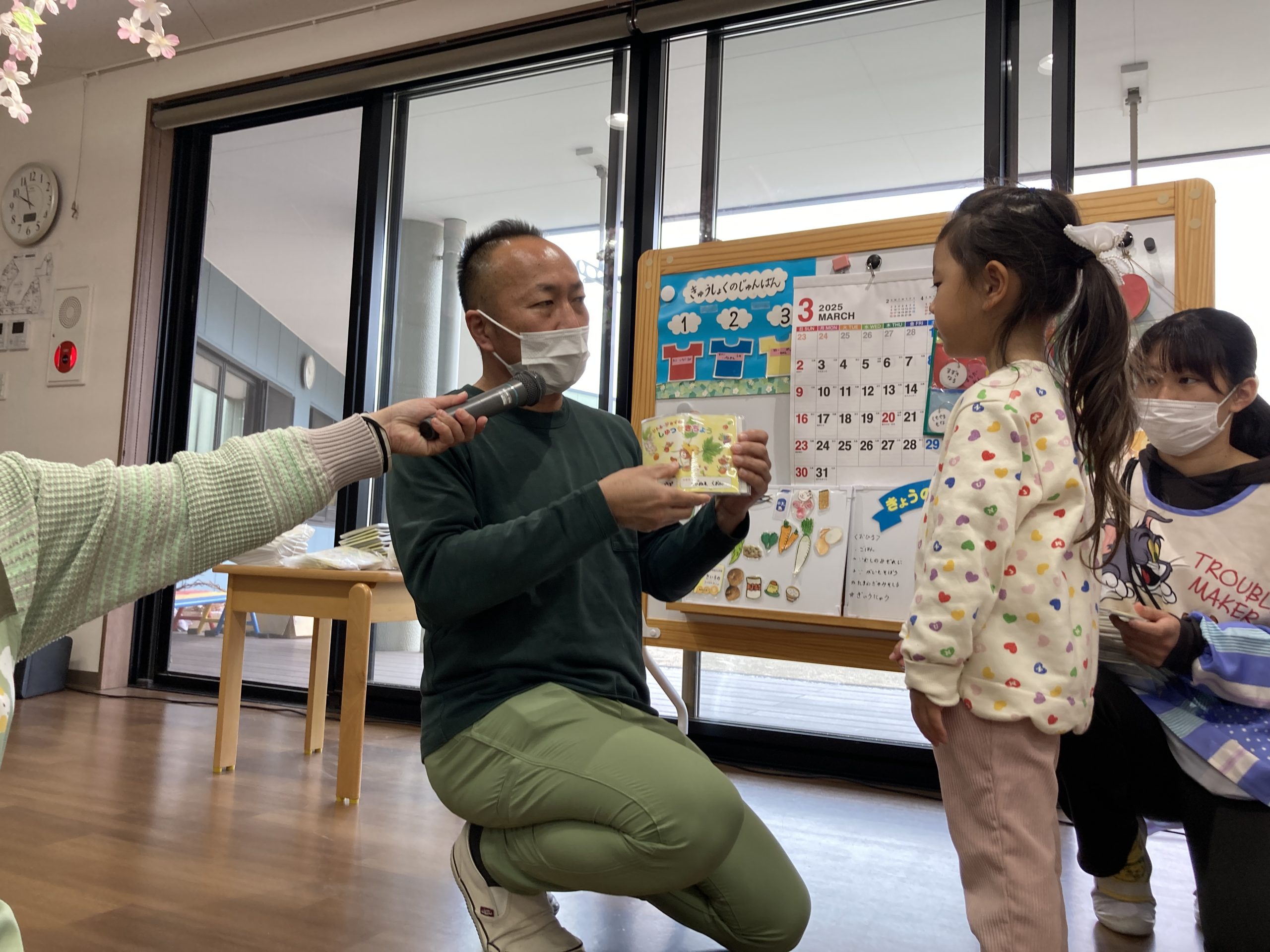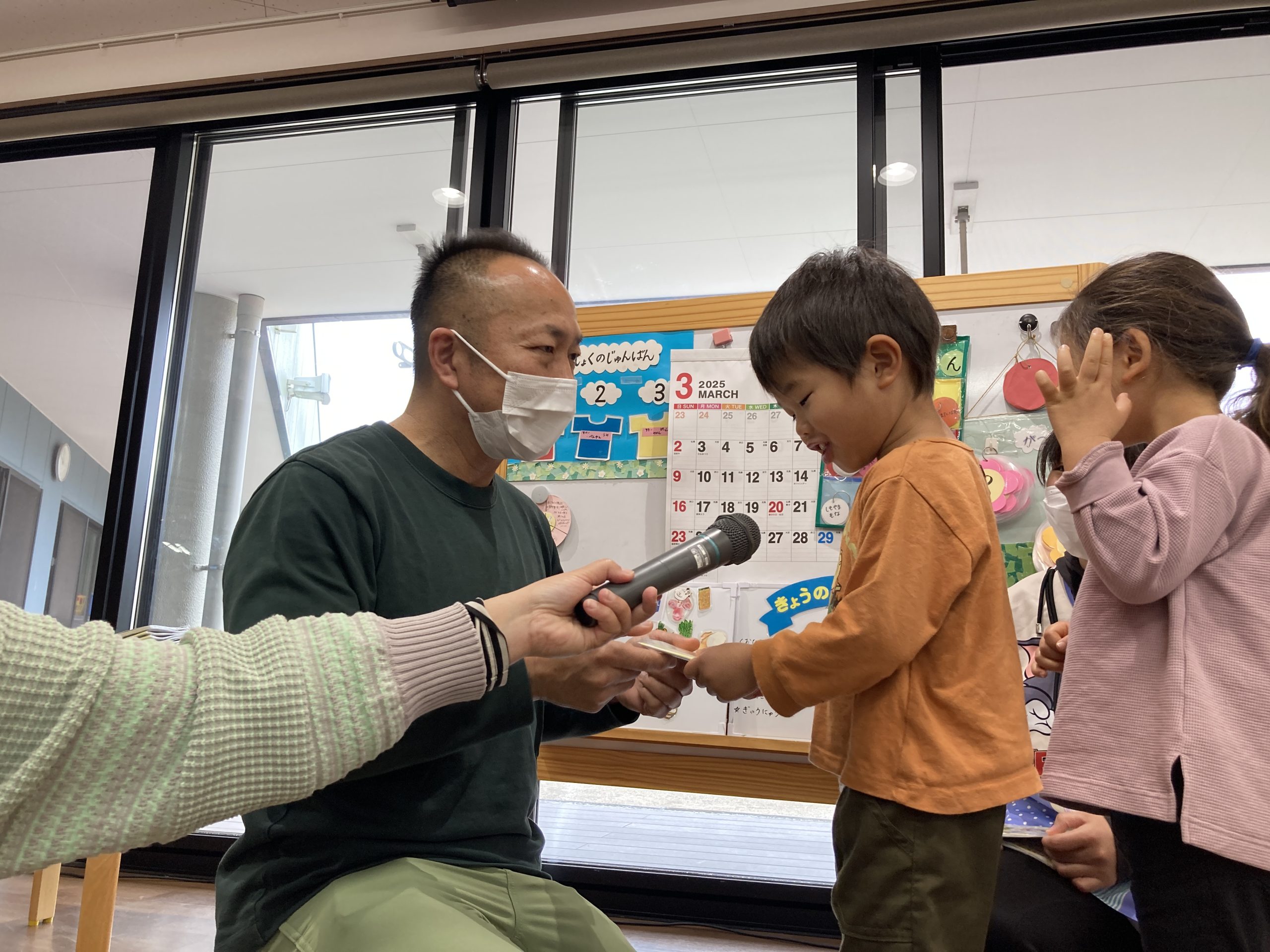 小さいお友達も園長先生から頂きました。みんなの前でしたが、泣かずに頂くことが出来ました。みんなからたくさんの拍手をもらってニコニコ笑顔でした。