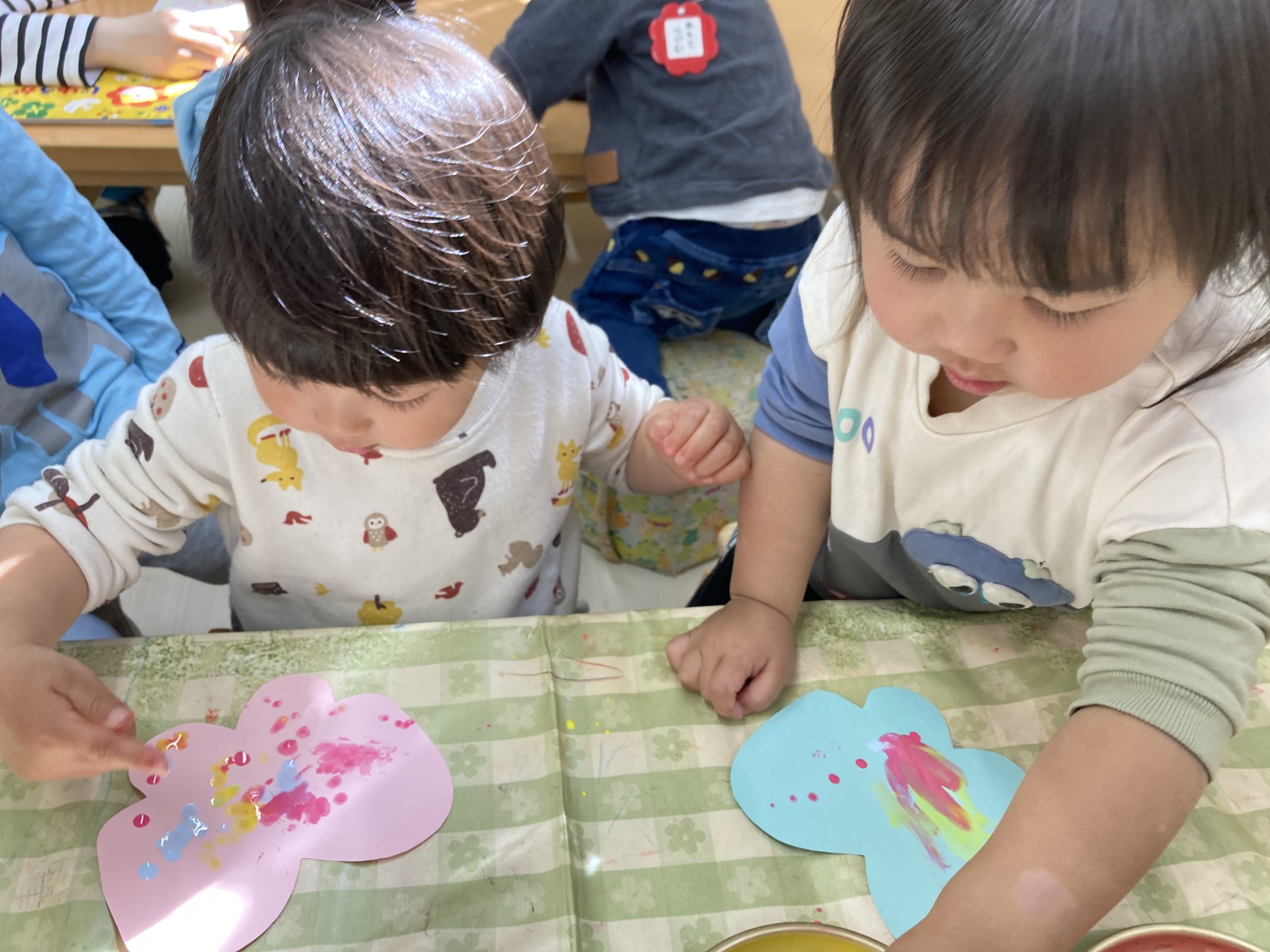 お部屋では散歩でも見たちょうちょ🦋制作をしました。好きな色のちょうちょを選び、絵の具を使って指スタンプです(*^^*)