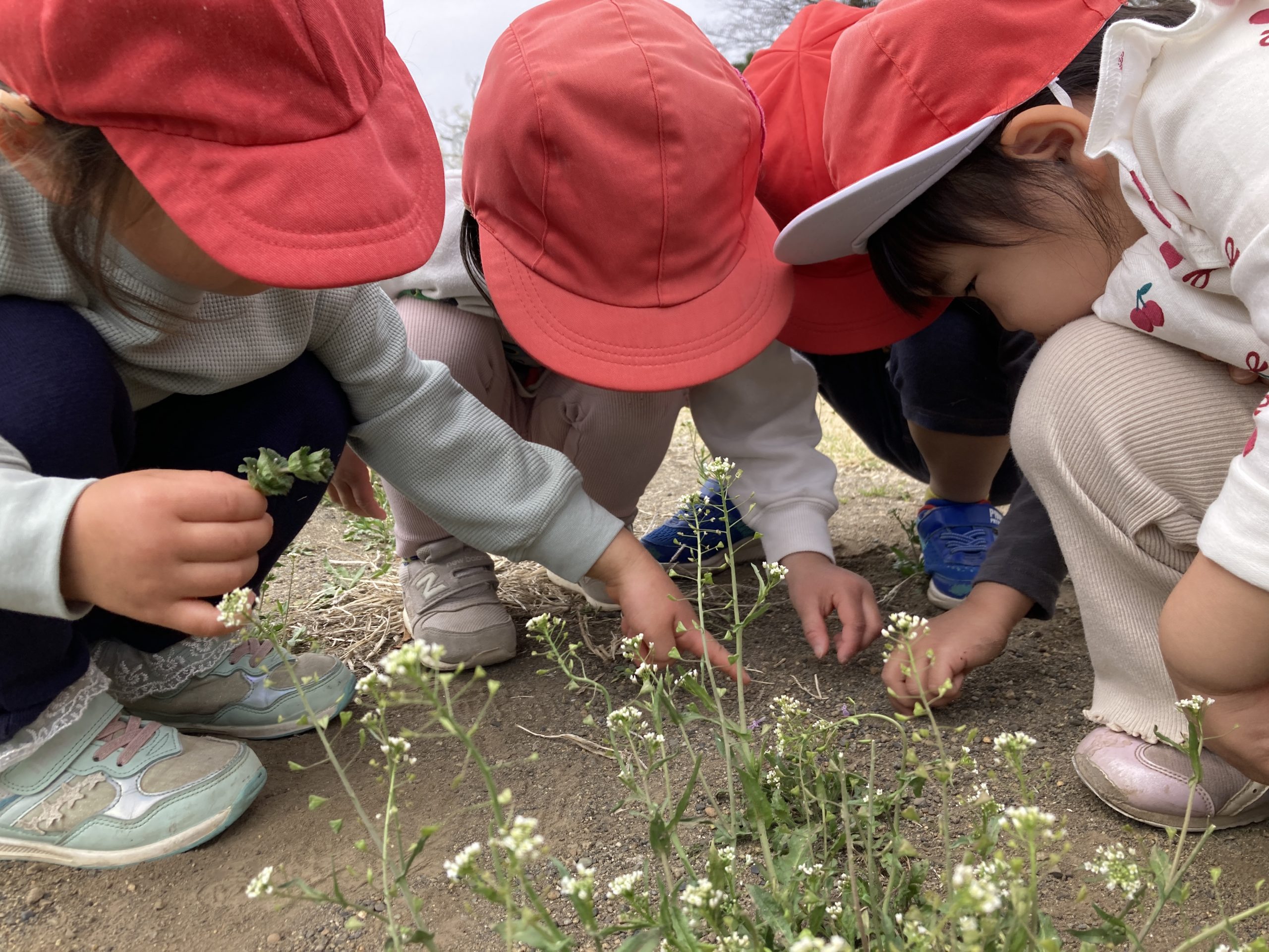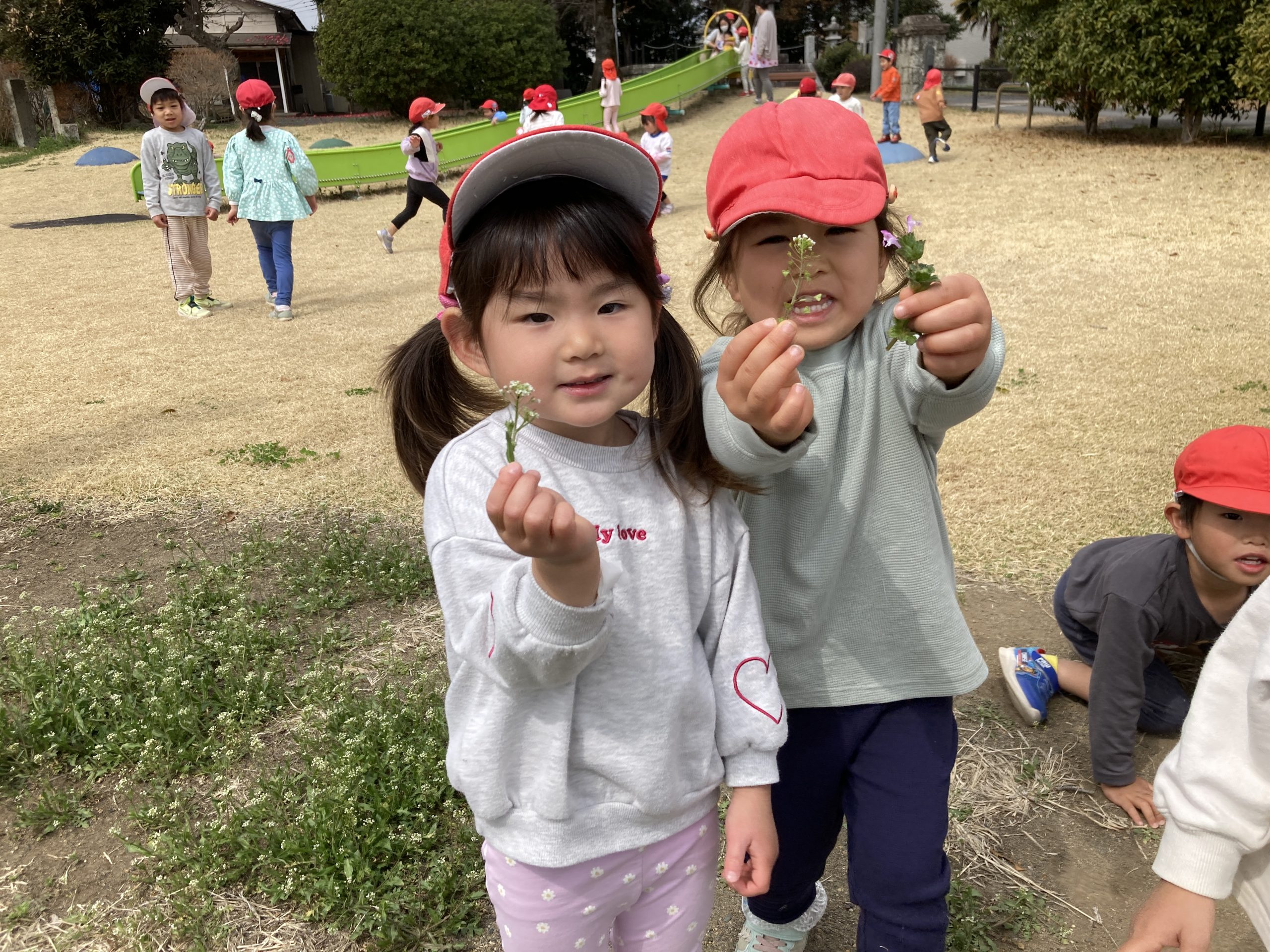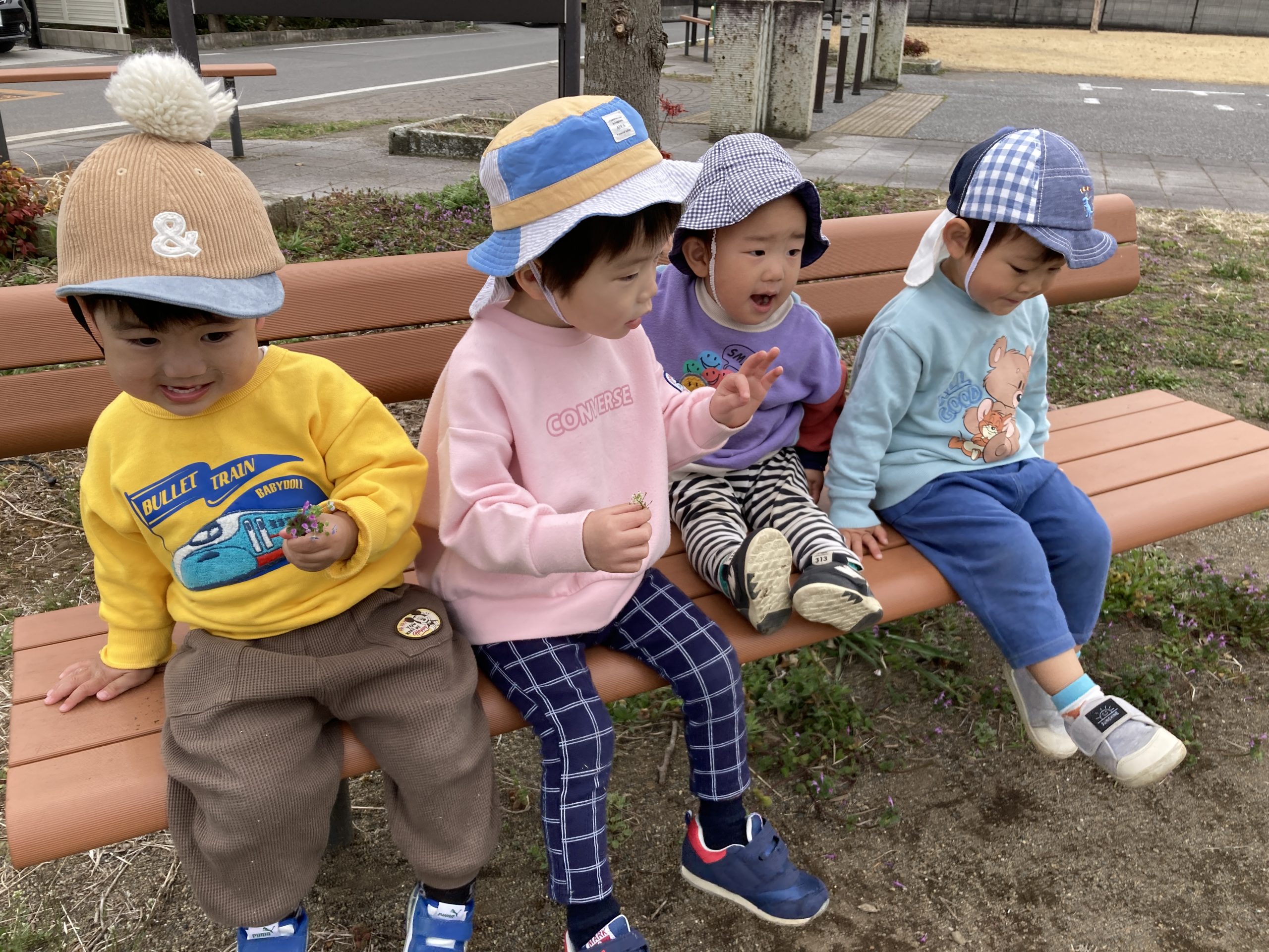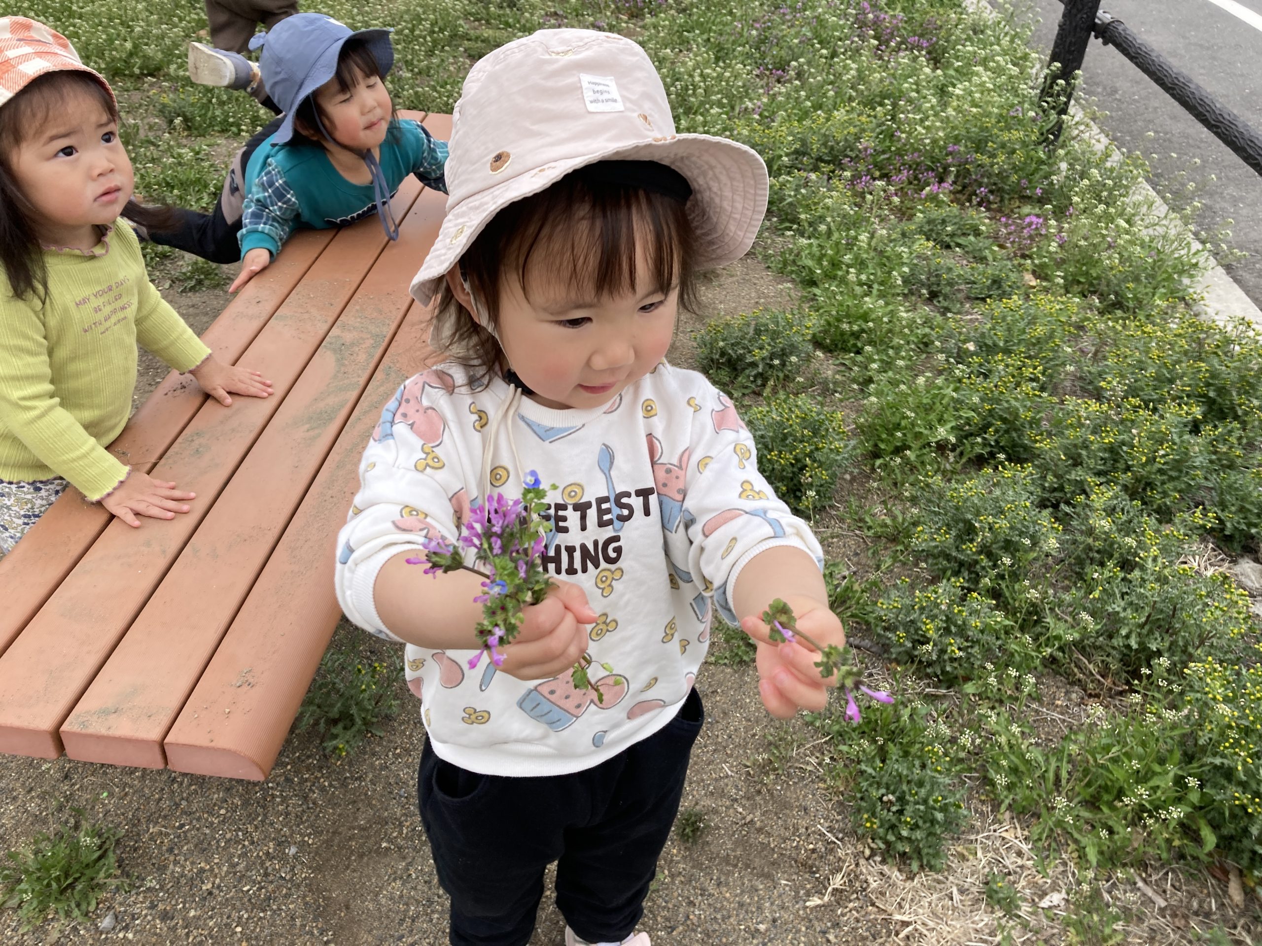 公園では小さい花がたくさん咲いていて、嬉しそうに摘んで大事に持っていました(^^♪ みんなで春を感じられたお散歩でした。