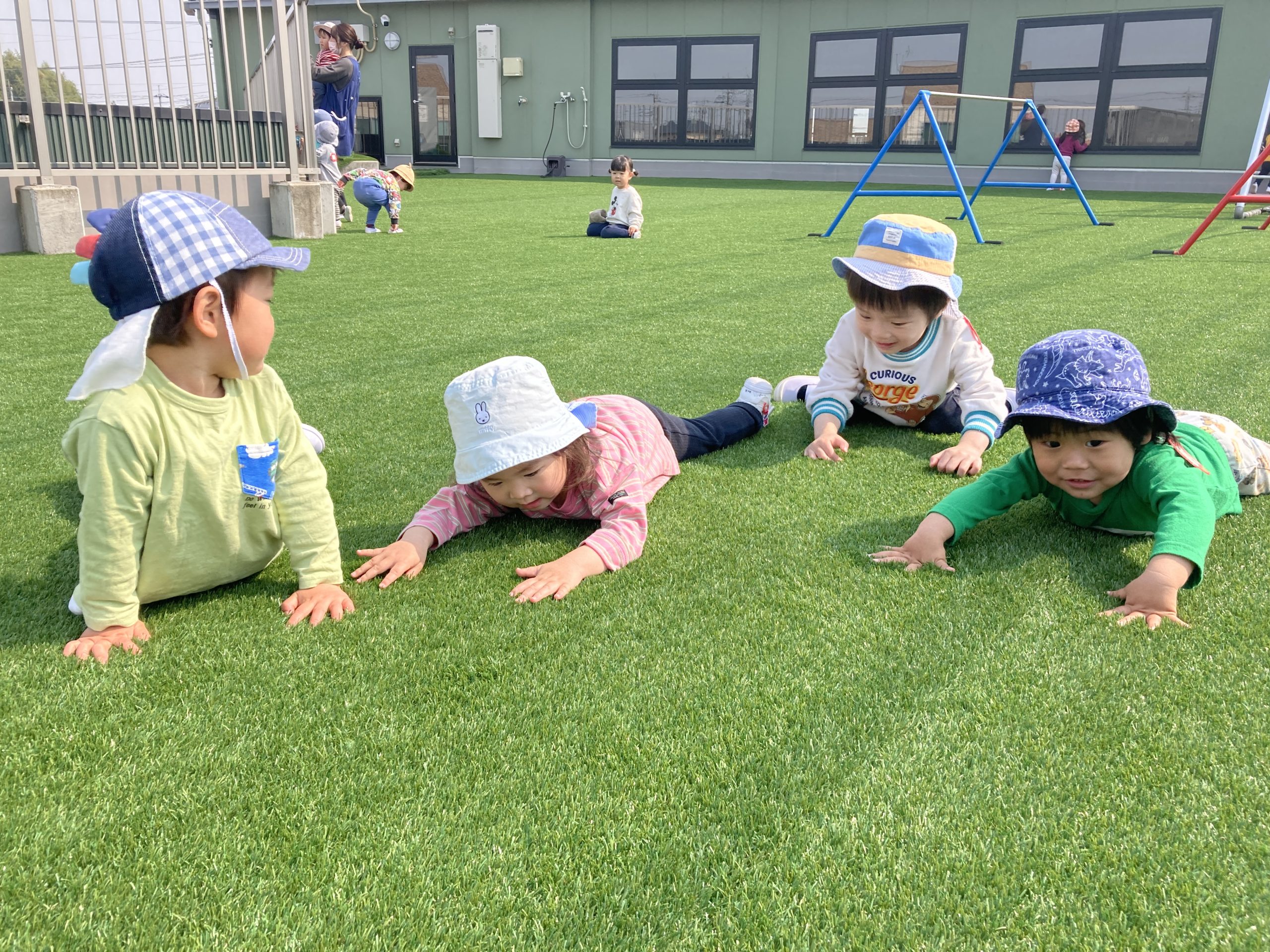 屋上では、鉄棒にぶら下がって足を高い位置まであげられるようになったり、寝転がって気持ちいいね~!(^^)!とにこにこしながら顔を見合わせている姿がとっても可愛かったです♡
