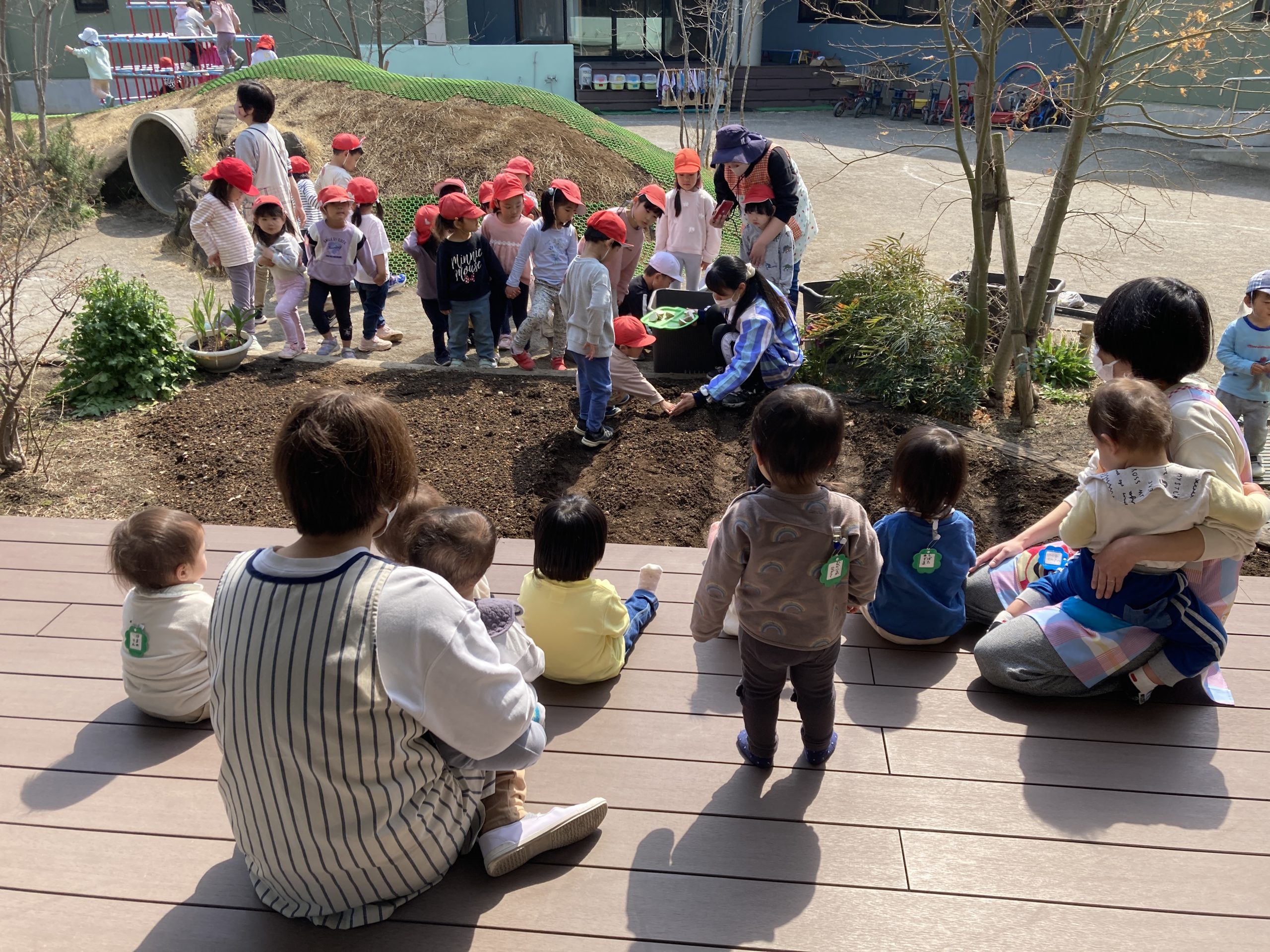 テラスに座ってみんなで見学しました。以上児さんが手で優しく土を被せていたり、切り口が下になるように植えていたりしていました。「大きくなるのが楽しみだね」と話をすると、嬉しそうな顔をしていました。今からじゃがいもの成長を楽しみにしているたまご組さんです。