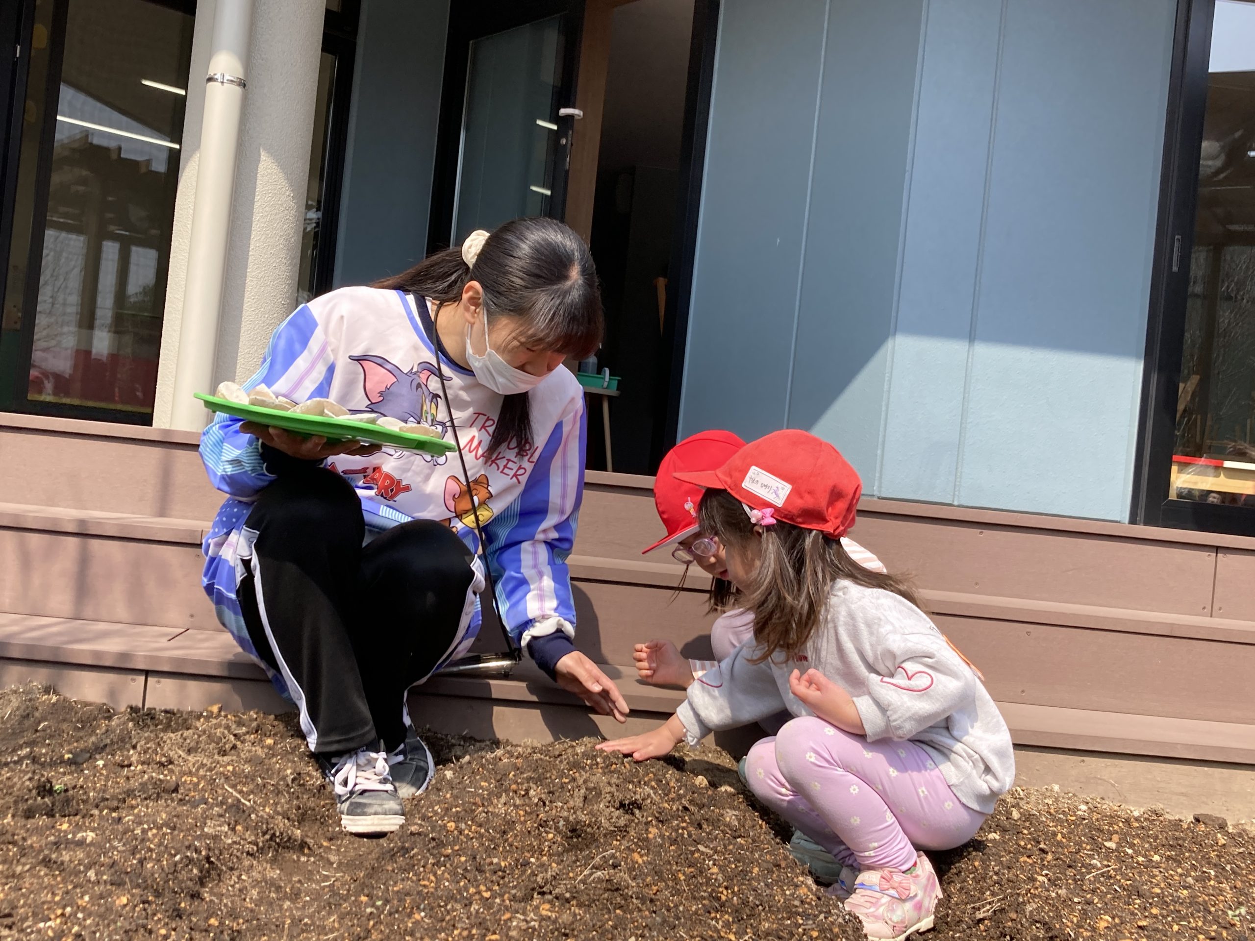 りす組さんは、少し緊張しながらも、じゃがいもに土を優しくかぶせました。無事にじゃがいもをすべて植え終わると、じゃがいも大きくなるかな?と楽しみにしていました!