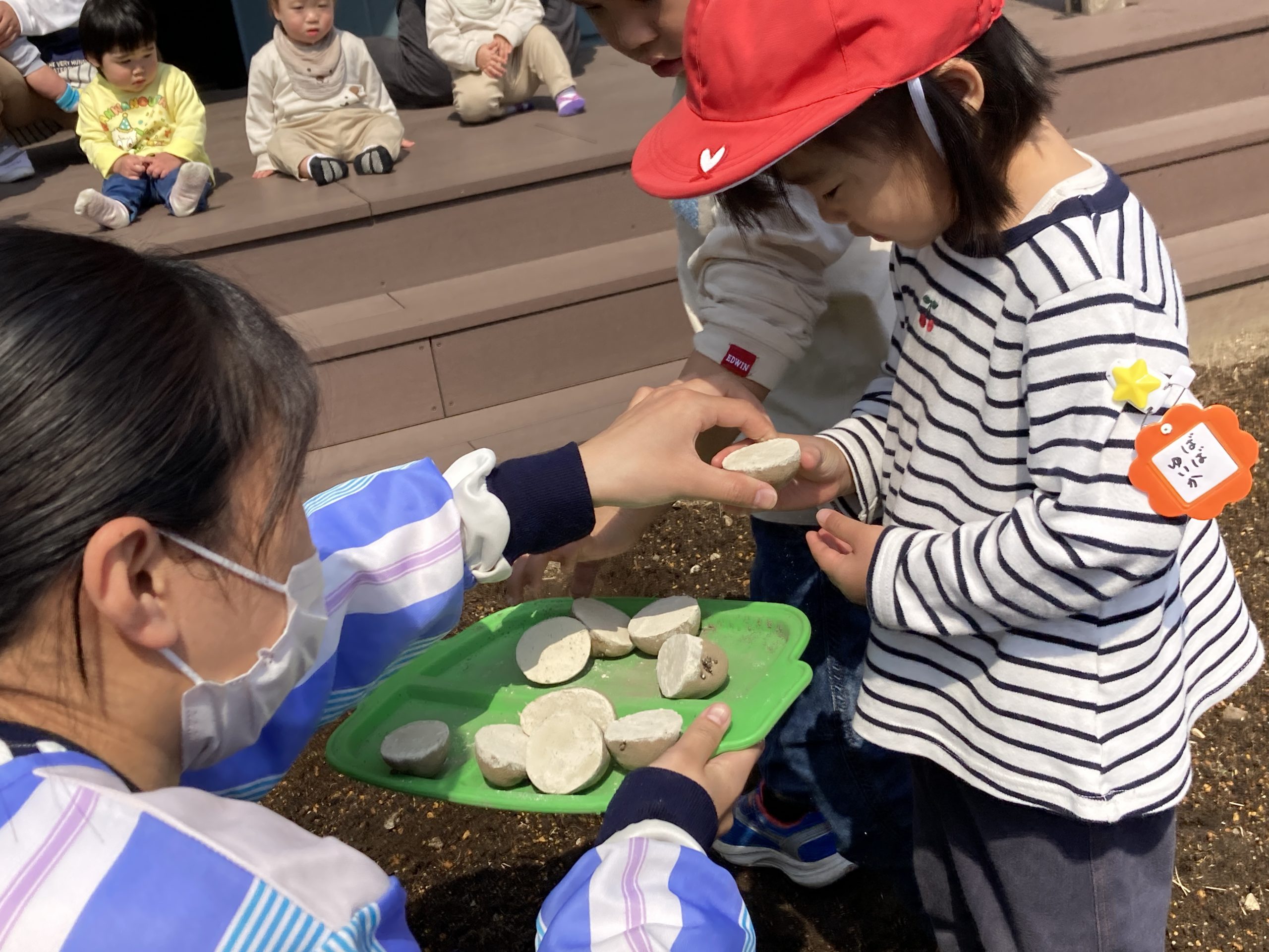 以上児さんが「じゃがいもの種植え」をしていたので、みんなで見学に行きました。半分に切ったじゃがいもの種を見せてもらいました。初めて見たものに興味津々で不思議そうに見ていました。